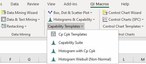 - QI Macros installs on Excel's menu. To open the template, click on QI Macros > Capability Templates > Cp Cpk Templates.