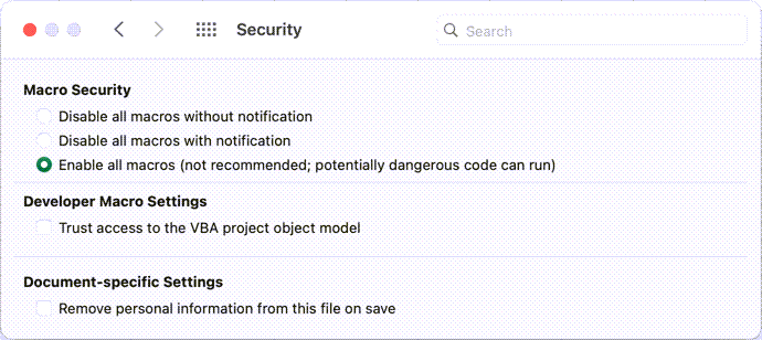 - Update the Security Preferences in Excel. To do so, click on the Excel drop-down in the top left corner and select Preferences > Security. Then, change the Security settings to "Enable all macros":
